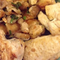 没做过,突发奇想试一下,其实是为了消耗一只整鸡里的肥厚鸡胸肉。香死了。成菜的豆腐内面和鸡茸都呈白色,配小葱,油汪汪,其实很美。
