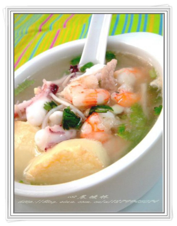 3. 再放入虾,鱿鱼,肉丝。锅开后放下盐。调一点茨汁倒下,搅匀,大火烧滚即可