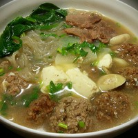 煮过肉又汆过丸子的汤滤清后烧开,下丸子,白萝卜、蘑菇、豆腐、卤牛肉切片下锅。红薯粉丝提前用热水泡软,下锅煮到变透明捞起放碗里。最后下菠菜,放盐调味,出锅盛入粉丝碗里,撒葱花香菜。