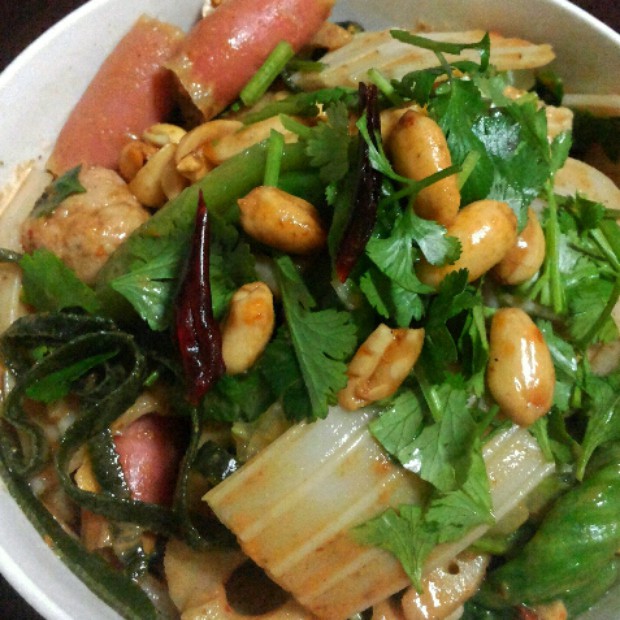 调料汁:芝麻酱,熟芝麻,少许白糖,陈醋,少许耗油,味极鲜酱油(蒸鱼豉油也可),麻油(炸麻椒后的油),老干妈,油辣子,孜然粉(或孜然碎),香油,按个人口味增减调料,加入烫熟的菜一起拌匀,吃时加香菜碎,酒鬼花生碎
