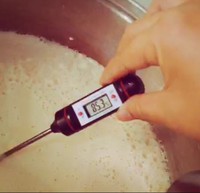 等待的时候把3g内酯?少许37度以内温水划开(ps:我买的内酯是一小袋3g的很实用、一般家里的称和量勺不准确、所以内酯不准确很影响脑的品质)、把80-90度豆浆倒入内酯里!