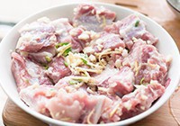将排骨倒入大盘子里,加入1勺盐、1勺鸡精、2勺淀粉,然后再倒入大蒜、姜丝和葱末,将材料搅拌均匀