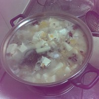 炖鱼的同时冷水下入切块的嫩豆腐烧开焯水沥出倒入鱼头中