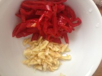 放入切好的空心菜大火翻炒,炒到变色放入准备好的红尖椒和蒜末一起炒30秒。