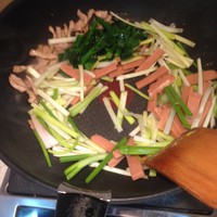 葱,韭黄,菜心,火腿肠切丝切段,放一旁备用