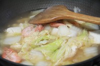 翻炒一会儿后,加入适量的盐,加水,水开后,调小火,加入几只虾(不用太多,调味即可),渐渐看到汤开始范白了
