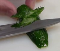 斜刀15度角切入黄瓜,并用手指协助推向一边