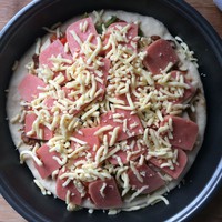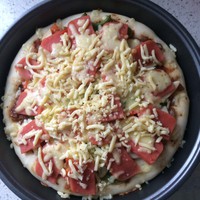 铺好火腿肉再撒一层奶酪,剩一下奶酪待用,烤箱预热200度10分钟后放入披萨盘,烤10分钟