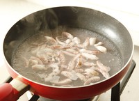 锅中适量清水烧开,放入料酒,倒入鱿鱼段焯水后捞出沥水备用。