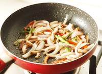 将洋葱、青红椒丝倒入锅内,炒至断生。