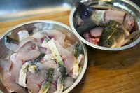 草鱼,把鱼头和鱼排剔出,鱼肉片成鱼片,鱼片不要太薄,大概1.5厘米左右,鱼骨和鱼片分别撒上盐,抓匀,静置15分钟。