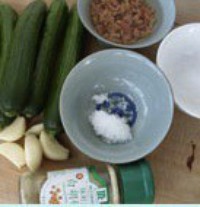 将荷兰小瓜洗净,切成稍候一点的片,大蒜用刀拍破,去蒜皮,切成蒜粒