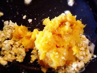 起熱鍋,用點橄欖油,小火微煎鹹蛋末,接著下南瓜塊。