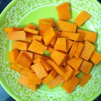 南瓜去皮洗净,将南瓜内壁的红瓤去干净,切丁入蒸锅蒸熟