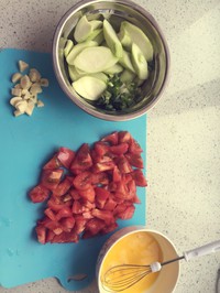 将准备好的丝瓜、番茄、香葱、蒜瓣洗净切好备用,两个鸡蛋打撒加少许糖,糖可以提鲜让鸡蛋更蓬松。
