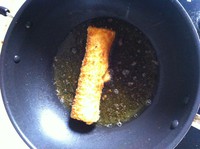 锅中倒入油开中火,烧至3-4成热的时候就可以放入蛋卷,先不要动,不然面包糠容易掉下来,然后翻面煎,要看着火,不然容易煎过了,煎至两面金黄就拿出来了。