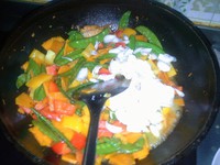 放入南瓜、红黄椒和雪豆中火翻炒一会儿