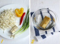 绿豆芽用剪刀剪去两头,然后用水冲洗干净;咸鱼用热水泡软,然后用手撕成小碎条