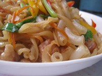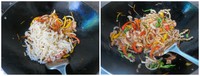 先煸炒猪肉,然后再是红黄椒跟胡萝卜,最后下通心粉,