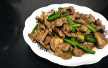 将锅烧热,锅中倒色拉油40克左右,油6成热时倒入葱蒜爆香,倒入猪肝翻炒半分钟左右,喷入5克料酒翻炒几下,加入生抽20ML,加入黑木耳,翻炒个1分钟,太干的话可以加个20克热水