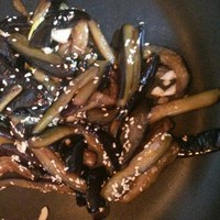 锅烧热,放少许油,放入茄条炒软,加两勺白糖继续翻炒出糖色,再加入酱油继续炒干。