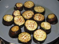 1. 长茄子切段,在横截面上切花刀,不粘锅倒少许油,煎制茄子段。
