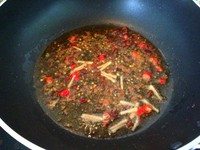 加入四季豆,不停的翻炒,然后加入一大茶杯水,太少容易干锅。四季豆不熟容易中毒,所以尽量焖时间长一点。中间要打开翻炒,以防干锅。
