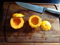 小南瓜洗净,切掉一个小盖,再用小勺子把瓤挖空