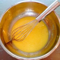 色拉油、糖(60g)和牛奶混合拌匀,蛋黄和蛋清分离,轻轻搅拌蛋黄,再倒入混合物中一起搅拌均匀
