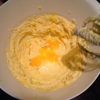 鸡蛋放至室温后均匀打散。加入少量蛋液至黄油中,并搅拌均匀。一开始看起来会有少许不均匀的分离状,打蛋器手感较滑顺易搅;仔细搅拌一段时间后,手感就会慢慢变的沉重,呈现平滑的乳化状态。加入奶油的蛋液要等完全搅拌均匀后再一点点加入,并重复搅拌动作。蛋液大约分4~5次加入。