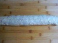 取出面团滚圆后松弛10分钟,再将面团擀成长、宽25cm的正方形,翻面后卷成柱状