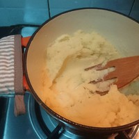 换工具!开小火,用“三叉戟”开始搅拌压好的土豆泥,让土豆泥里的水分稍微蒸发掉一点。没有标准,没有时间,看心情……
