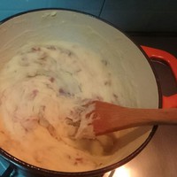 继续小火,开始加牛奶。牛奶的量也没什么标准。每个人对奶香的需求度不同,甚至在不同的时候也不一样的呀。今天加了普通饭碗半碗,试了味道够奶了。出锅前再试下咸淡,不够嫌的话撒点盐。风干肉本身是有咸味的。