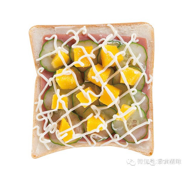 2.取一片土司,放上素火腿,铺上小黄瓜片,放入芒果丁,再挤上纯素美奶滋即可。