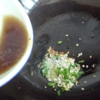 炒锅放底油,放入葱姜蒜末爆香,倒入蒸茄子的汤汁,如果汤汁太少,适当加些水。