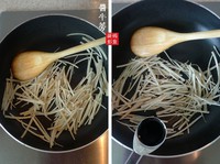 锅里放少量油,将牛蒡丝炒五分钟,放入酱油。
