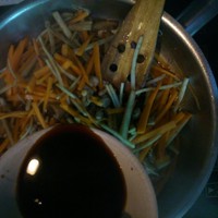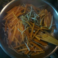 热锅倒入麻油,快炒鸡丁至变白放入香菇丝炒香,然后倒牛蒡丝炒,最后下胡萝卜丝炒炒。