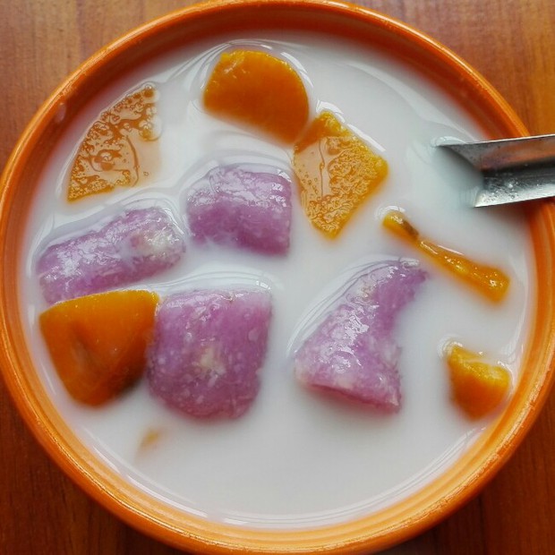 把淮山圆加入红薯糖水里,倒入牛奶。当然,我们纯手工的也可加冷饮或冰淇淋搭配椰汁什么的。