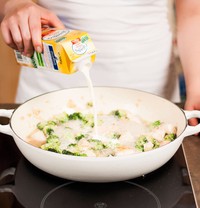 拌入鲜奶油,加入一些煮面汤,煮5-7分钟左右,至汤汁收浓。