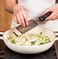 在汤汁中加入少许肉豆蔻、盐和黑胡椒调味。将意式通心粉倒入汤中轻轻搅拌,盛入深盘。上桌!