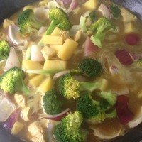 1??加水盖过土豆鸡肉,加多点可以。2??用大火炖至开锅、撇沫。3??加入咖喱粉宁多勿少因为滋味全靠咖喱。