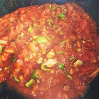 放意面酱和青椒!青椒我是个人喜欢辣所以我就放了…咕嘟咕嘟吧!注意火小一点,不然很容易就糊了…还有翻搅酱汁的时候一定要小心!我之前熬意面酱的时候就把手烫了一个大泡…疼爆了!