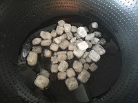猪肉切成30mmx30mm方块,锅内烧开水,放入肉块氽烫约5--7分钟