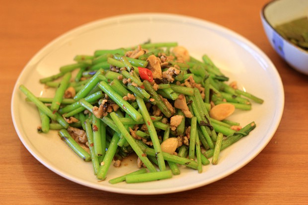 温锅温油炒散肉末,变色后拨到一边,爆香蒜片、小米辣,倒入茼蒿杆大火翻炒,加生抽调味
