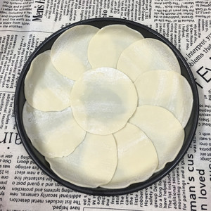 披萨盘涂一层黄油或食用油,放入饺子皮。