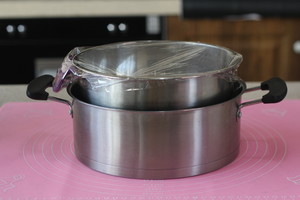 再次将玫瑰隔温水发酵至两倍大,大约1小时左右(温水大约40度左右,期间如果变凉的话需要加热水在隔水盆里)。