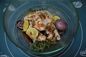 将三黄鸡涂满腌制酱料,均匀仔细的将鸡各个部位都涂上腌制料,里外都要涂抹;随后切几片洋葱和青柠檬,并且放入未切碎的百里香和迷迭香一根,一起腌制;将玻璃盆用保鲜膜密封,放入冰箱腌制一夜,如没有时间腌制一夜,至少也要腌制6小时以上