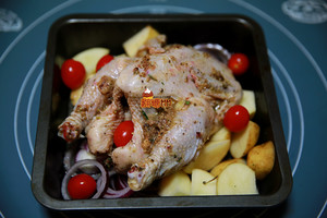 将烤鸡摆放在正中间,腌制时的洋葱可塞入烤鸡腹中,随后点缀若干小西红柿,TIPS:小西红柿烤出来非常好吃哈~