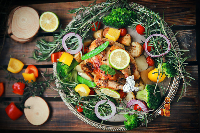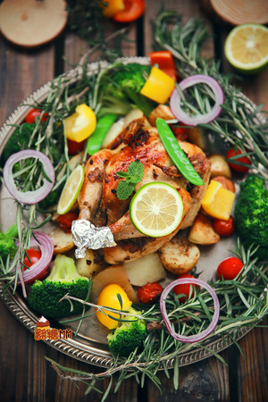 森林系餐桌最重要的就是使用大量蔬菜,色彩丰富,造型随意,所有的蔬菜都像是不经意放上的,但每个都是精心摆的,首先将西兰花煮熟,选五朵围绕烤鸡摆放,新鲜迷迭香和百里香洗净,围绕烤鸡盘在四周,彩椒切块,随意摆放小西红柿点缀其中;洋葱切成洋葱圈,两三个均匀搭在盘子上,青柠檬切片,摆放在烤鸡上面,荷兰豆煮熟于烤鸡上面,最后一小片薄荷叶放在正中~~造型完成~很像圣诞花环~~