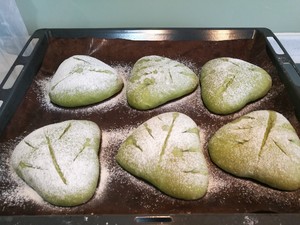 把面粉,糖,水,奶粉,炼乳,抹茶粉加入主锅。 揉面模式1分钟。